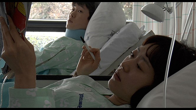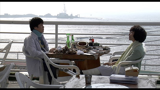 This film provides as unusual experience. Despite their terrible situation, this couple act too ordinarily, which presents grotesque feeling and pleasure. They try to do whatever they can with their injured bodies. It presents positive energy of a delightful life. However, as I saw this film repeatedly, I realized it looks bizarre and gloomy. Is it because I find the shadow of death in ordinary everyday life? Their ordinary acts may come from their efforts to restrain their angst about death and separation hovering around them. Weirdly, they do not recognize a woman in purple hanging around them. As the woman appears as a figure of death, they are aware of her existence silently. However, they leave the place as if nothing happened. It is not the characters in the film but camera that catches angst about death and boredom hidden in everyday lie. That’s why there is a terrible chill in the space they have occupied. Reviewed by MAENG Soo-jin